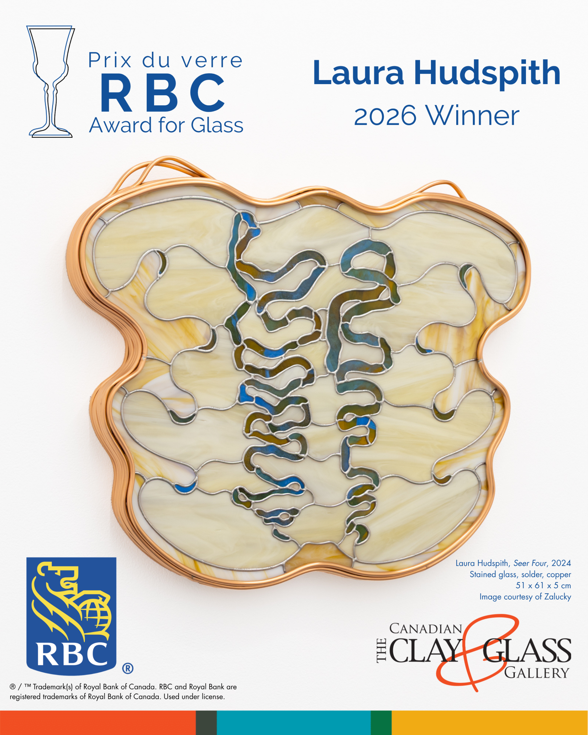 “The work of Laura Huspith’s thoughtful blending of historic stained glass techniques with a fresh, contemporary, narrative offered the jury a richly layered, visually arresting story, that is technically proficient and conceptually engaging, placing her as this year’s winner of the RBC Award for Glass. Kudos to all!”
